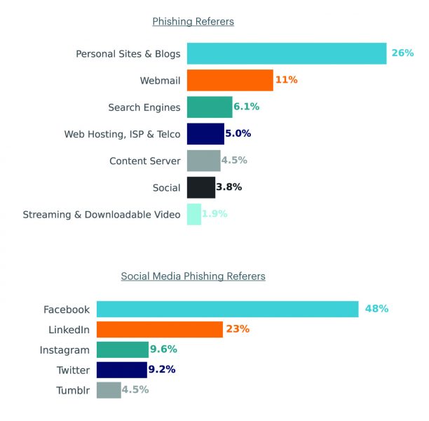 Tradicionalmente considerada la principal amenaza de phishing, el 11% de las alertas de phishing fueron remitidas desde servicios de correo web, como Gmail, Microsoft Live y Yahoo. Asimismo, los sitios web personales y los blogs, en particular los alojados en servicios de alojamiento gratuitos, fueron los remitentes más comunes de los contenidos de phishing, ocupando el primer puesto con un 26%. El informe también identifica dos métodos principales de remisión de phishing: el uso de enlaces maliciosos a través de spam en sitios web y blogs legítimos, y la utilización de sitios web y blogs creados específicamente por los ciberdelincuentes para promover el contenido de phishing.