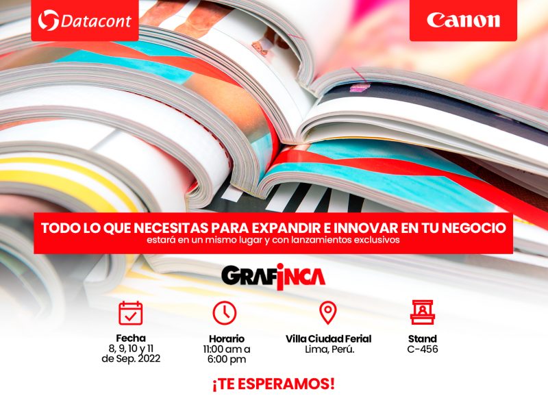 Con alegría anunciamos que Canon, compañía líder en impresión digital a nivel mundial, junto a Datacont, empresa peruana con más 54 años de experiencia en distribución de productos tecnológicos de vanguardia, estarán presentes del 8 al 11 de septiembre en el STAND C – 456 de la feria Grafinca 2022. En esta ocasión, Grafinca 2022 se desarrollará en la Villa Ciudad Ferial, un nuevo recinto en Lima Metropolitana para realizar negocios, y que contará con todas las comodidades para los expositores, visitantes, proveedores y organizadores.