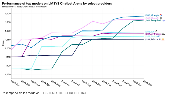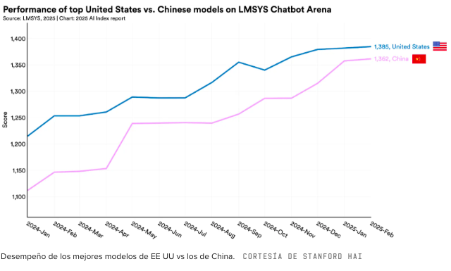 El año en que ChatGPT se hizo viral, solamente dos empresas estadounidenses, OpenAI y Google, podían presumir de una inteligencia artificial realmente de punta. Tres años después, la IA ya no es una carrera de dos caballos, ni tampoco puramente estadounidense. Un nuevo informe publicado por el Instituto de Inteligencia Artificial Centrada en el Ser Humano (HAI) de la Universidad de Stanford pone de relieve lo saturado que se ha vuelto este campo.