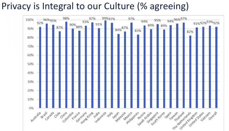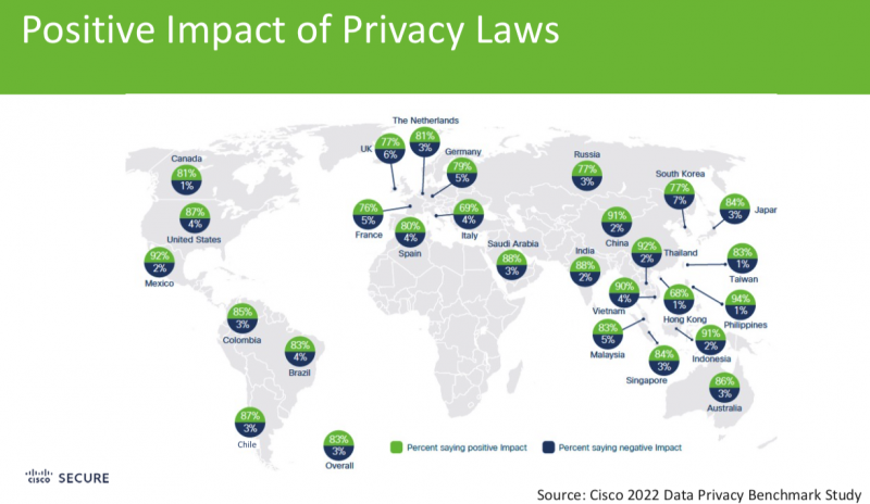 La legislación en materia de privacidad sigue siendo muy bien recibida en todo el mundo, a pesar de que el cumplimiento de estas leyes suele suponer un esfuerzo y un costo considerables, por ejemplo, catalogar los datos, mantener registros del procesamiento de actividades, aplicar controles – privacidad por diseño, responder a las peticiones de los usuarios. El 83 % de todas las empresas encuestadas afirmó que las leyes de privacidad han tenido un impacto positivo, y sólo el 3 % indicó que las leyes han tenido un impacto negativo.