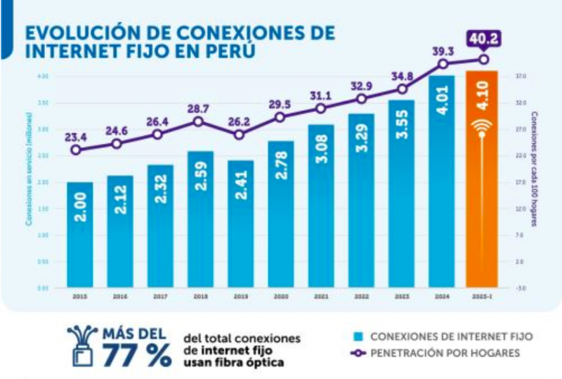Al cierre del primer trimestre de 2025, el servicio de internet fijo alcanzó un nuevo máximo histórico con cerca de 4.1 millones de conexiones, representando un crecimiento del 11.9% frente al mismo periodo del año anterior, según informó el Organismo Supervisor de Inversión Privada en Telecomunicaciones (Osiptel).