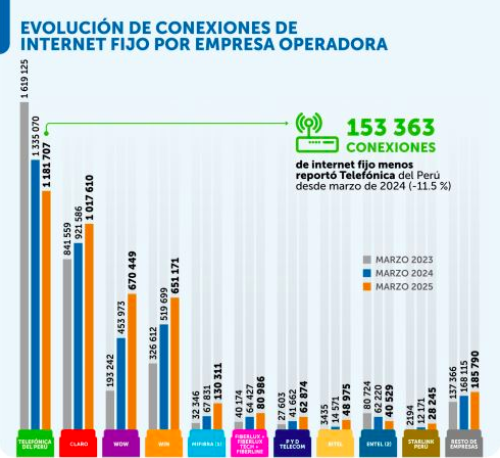Según datos procesados por la Dirección de Políticas Regulatorias y Competencia del Osiptel, Telefónica del Perú experimentó una disminución de 153,363 conexiones de internet fijo (-11.5 %) en comparación con marzo de 2024, lo que redujo su participación en el mercado al cierre del primer trimestre de 2025.