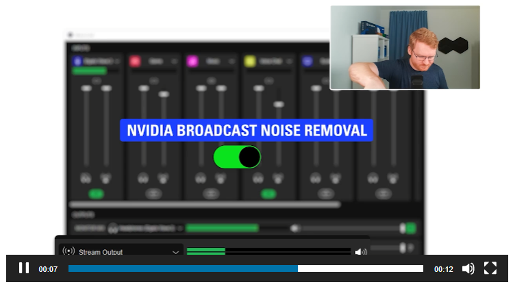 Al ejecutarse en los Tensor Cores en las GPU GeForce RTX, las nuevas funciones usan IA para identificar las voces de los usuarios, separándolas de otros sonidos ambientales. Dando como resultado una cancelación de ruido que mejora drásticamente la calidad de las llamadas de audio y video. Los ruidos de fondo de los ventiladores, las charlas, las mascotas y más desaparecen, dejando la voz del orador nítida. Broadcast también cancela los ecos de la sala, proporcionando una acústica amortiguada con calidad de estudio en una amplia gama de entornos sin necesidad de insonorizar las paredes o los techos.