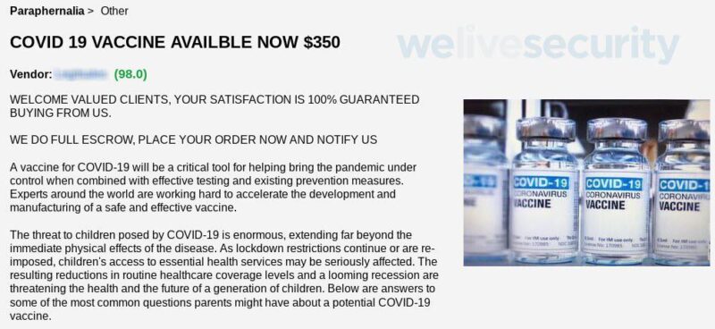 La vacuna contra el COVID-19 es sin dudas uno de los que más atención acapara a nivel mundial. Es por lo que, lamentablemente, también representa una oportunidad para los cibercriminales de encubrir sus estafas u acciones maliciosas. ESET, compañía líder en detección proactiva de amenazas, analiza engaños vinculados a la venta o acceso a las vacunas contra el COVID-19 en la dark web.
