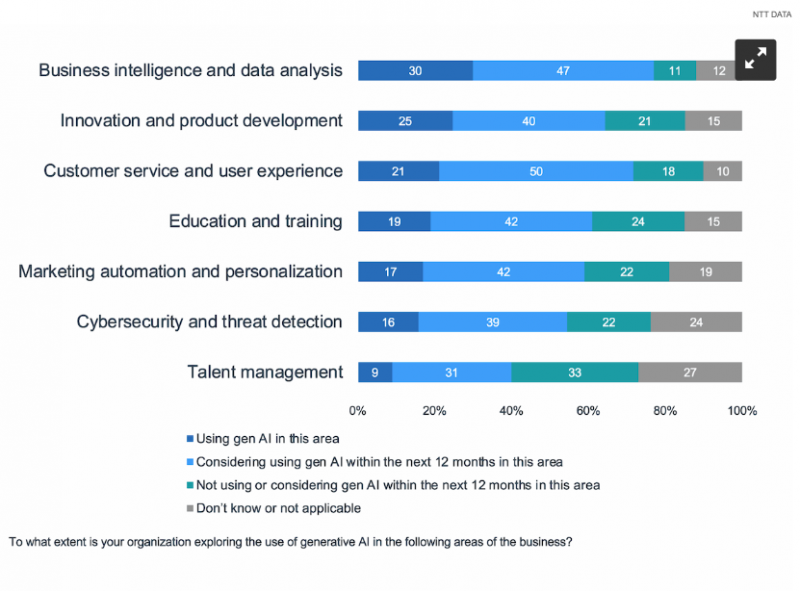Según el estudio, el 84 % de los encuestados cree que es probable que la IA genere un cambio competitivo en el sector de su organización. Cabe destacar que las empresas no están utilizando las capacidades de la inteligencia artificial para una sola tarea o caso de uso, pues, por ejemplo, 30 % de los participantes dijo que la utilizan para inteligencia empresarial y 25 % para la innovación y desarrollo de productos.