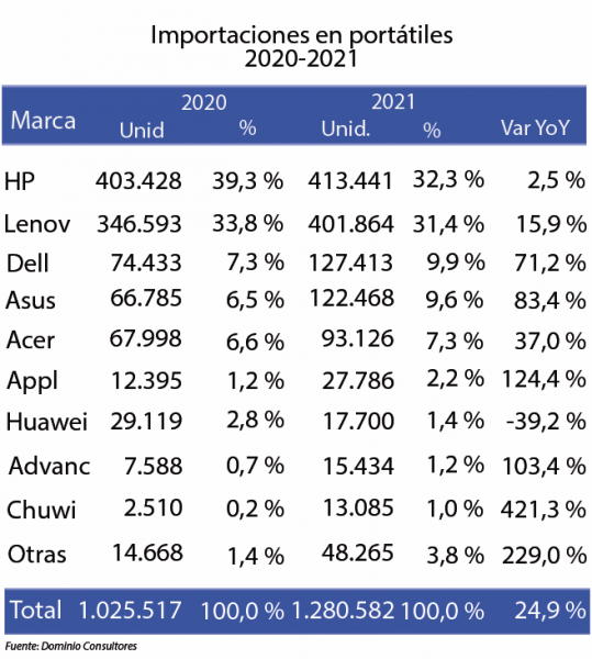 En este segmento tenemos un crecimiento del 25 % en unidades año contra año. El 2021 ha sido un buen año para la venta de portátiles en el país. Hay un dato destacable y es la caída de Huawei, que veníamos viendo y llega a – 39 %.