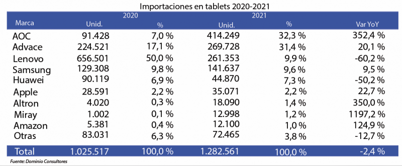 Esta categoría tuvo un ligero decrecimiento de 2021 contra 2020, pero esto es fruto de las compras de Ministerio de Educación (MINEDU) que distorsionan la tendencia. Algunos productos el 2021 han logrado un “hipo” de crecimiento, por lo que faltó comparar el año anterior, en el 2022 el crecimiento podrá ser menor. Si observamos las cifras, el crecimiento es principalmente por la adquisición de tablets que realizó el MINEDU en el 2020, por lo que el decrecimiento de Lenovo del 60 % no lo es como mercado real. Sin las compras del Estado podríamos ver cifras de crecimiento de las diferentes marcas.