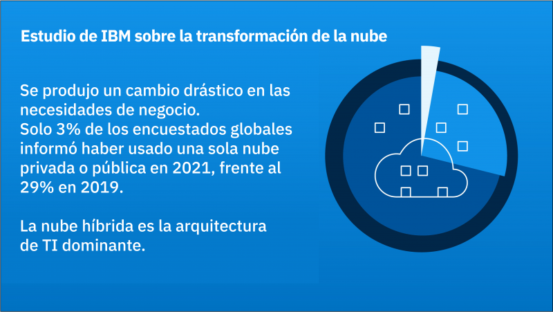 De acuerdo con los resultados del nuevo estudio global de IBM sobre la transformación de la nube, se ha producido un cambio drástico en las necesidades de negocio ya que solo el 3% de los encuestados informó haber usado una sola nube privada o pública en 2021, frente al 29% en 2019, lo que establece a la nube híbrida como la arquitectura TI dominante.