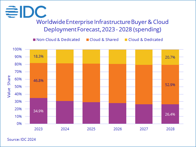 Para 2024, IDC prevé que el gasto en infraestructura de nube crecerá un 19.3% comparado con los US$ 129.9 mil millones de 2023. La infraestructura que no corresponde a nube se espera que decaiga un 1.4% hasta US$ 57.6 mil millones. La infraestructura compartida de nube se prevé que crezca un 21.6% interanual hacia los US$ 95.3 mil millones para todo el año; en tanto que el gasto en infraestructura de nube dedicada se estima tenga un robusto crecimiento de 13.3% en 2024 hasta los US$ 34.6 mil millones para todo el año. Las previsiones de crecimiento moderado para infraestructura que no corresponde a nube, que se estima caerán un 1.4% interanual en 2024, refleja la expectativa de que el mercado aún enfrentará algunos desafíos. El gasto en nube continuará muy positivo gracias a las nuevas cargas de trabajo de misión crítica, que suelen requerir sistemas de alta gama orientados a mejor performance.
