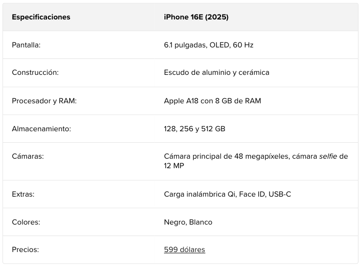 El iPhone 16E se puede reservar a partir del 21 de febrero por 599 dólares en Estados Unidos, lo que elimina la opción de comprar un iPhone por menos de 500 dólares. La venta oficial comenzará el 28 de febrero. Estas son las novedades del último iPhone de Apple.