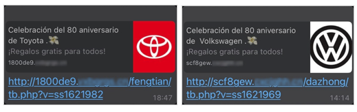 Imagen 1. Mensajes fraudulentos en WhatsApp haciendo referencia a las supuestas celebraciones del 80 aniversario de Toyota y Volkswagen respectivamente.