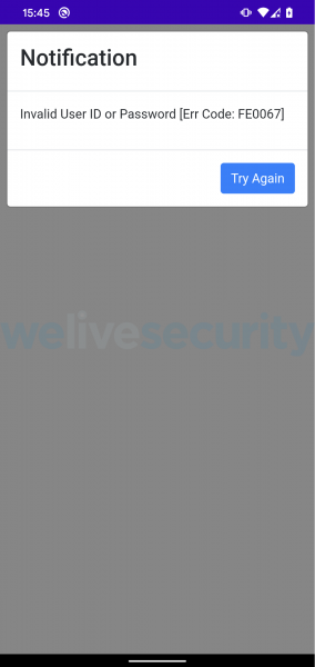 Después de que las víctimas envíen sus credenciales bancarias, reciben un mensaje de error que les informa que el nombre de usuario o la contraseña que proporcionaron no es válida. En este punto, las credenciales ingresadas ya se han enviado a los operadores de malware.