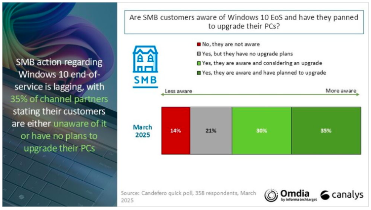 Una sorprendente cantidad de PYMES no están preparadas para el final de Windows 10, asegura la consultora. Más de un tercio de las empresas consultadas (un 35%) entre socios de canal, dijeron que sus clientes de desconocían la fecha límite de fin de servicio (EoS) de Windows 10 o no tenían planes para actualizar sus PC. De ese 35%, el 21% de los clientes de pymes conocen la inminente finalización del servicio de Windows 10, pero no tienen planes de actualizar, mientras que un 14% desconoce por completo la fecha del final de Windows 10.