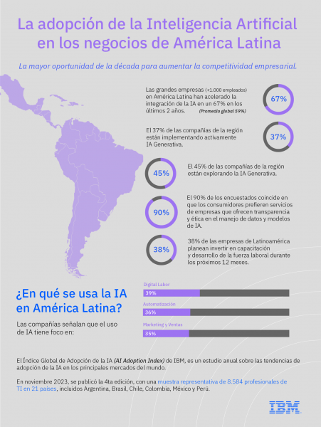 Una nueva investigación realizada por Morning Consult para IBM, llamada IBM Global AI Adoption Index 2023, encontró que las organizaciones de Latinoamérica con más de 1.000 empleados agilizaron la implementación de Inteligencia Artificial (IA). De hecho, 67% de los profesionales de tecnología de Argentina, Brasil, Chile, Colombia, México y Perú dijeron que sus organizaciones aceleraron el uso de IA en los últimos 24 meses. Esta cifra está por encima de la media mundial, que es del 59%.