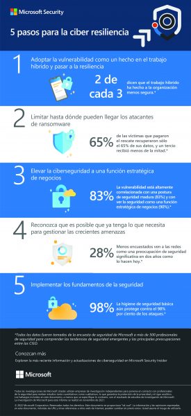 “La implementación de una estrategia de Confianza Cero no es nada compleja. Los pasos son medidas de higiene que deben considerarse en cualquier compañía que desee protegerse y mitigar los riesgos de seguridad. El modelo de Confianza Cero nos protege contra el 98% de los ataques. Para combatir ese 2% de vulnerabilidades, Microsoft aplica cinco pasos para lograr resiliencia cibernética”, afirmó Felman.