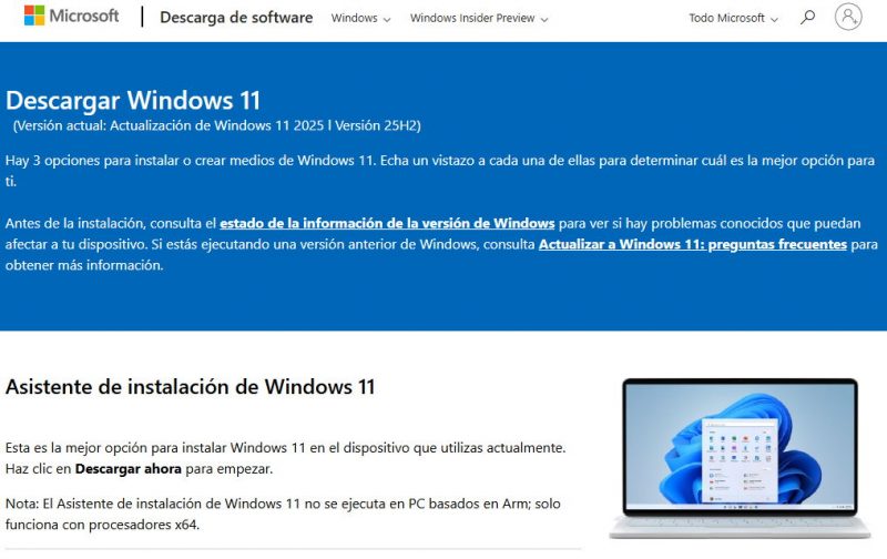 – Otra opción igual de simple es visitar la página web de descarga de software de Windows 11. Ahí verás como Microsoft la ha actualizado a Windows 11 2025 l Versión 25H2. La manera más sencilla es usar el ‘Asistente de instalación de Windows 11‘. Haz clic en el botón ‘Descargar ahora’ y sigue las instrucciones: