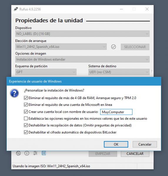 A pesar de la supuesta «inflexibilidad» de Microsoft, actualizar o instalar desde cero equipos que no cumplan con los requisitos a la versión final de Windows 11 25H2 es tan sencillo como en PCs compatibles. Solo tienes que usar Rufus y en la creación del medio activar la eliminación de requisitos: