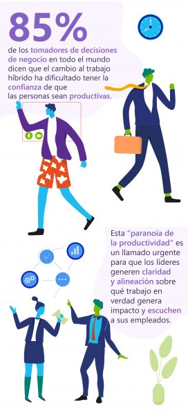 - Poner fin a la paranoia de la productividad: El 87% de los empleados afirman que son productivos en el trabajo, pero el 85% de los líderes aseguran que el cambio al trabajo híbrido ha dificultado confiar en que sus empleados son productivos. Los líderes necesitan brindar claridad y alineación, eliminar las tareas de poco valor que no apoyan esos objetivos y escuchar a su gente: el 57% de las compañías rara vez, si acaso, recopilan retroalimentación de los empleados.