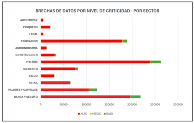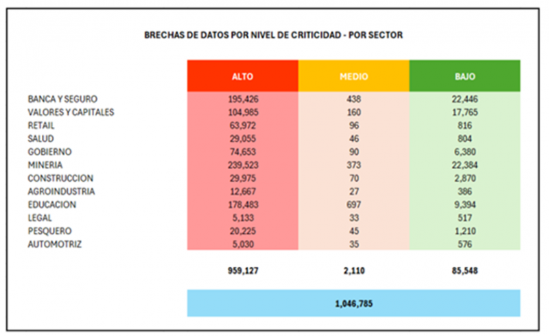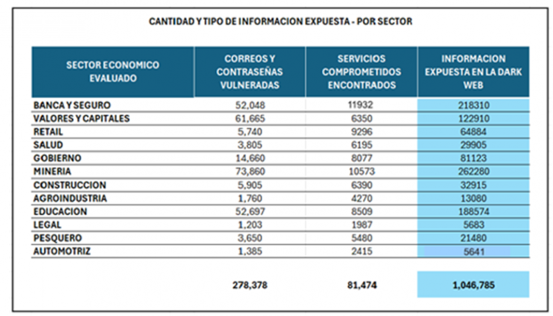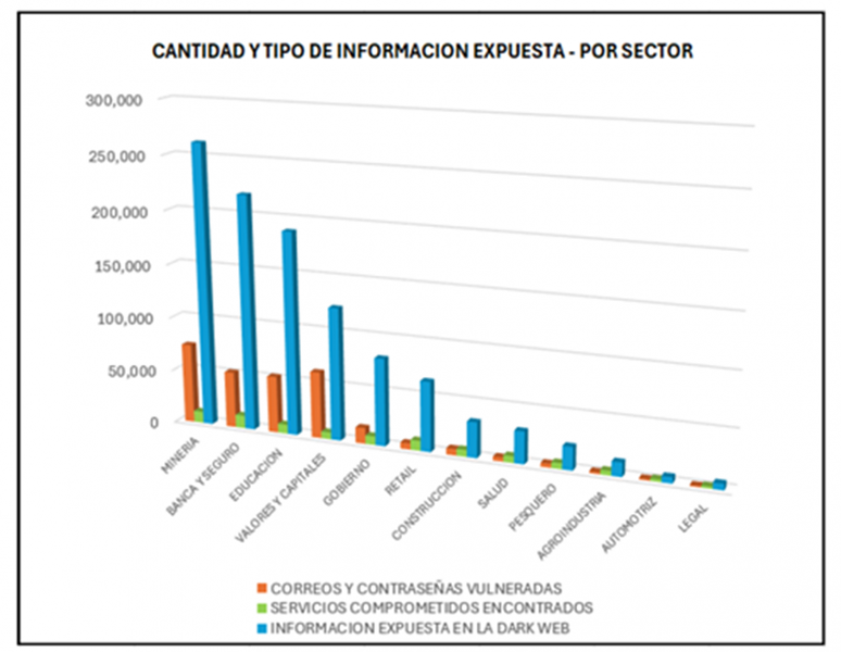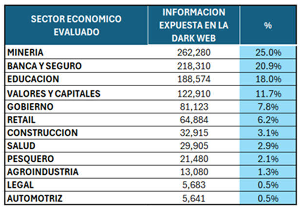 De acuerdo al estudio, los sectores del país con mayor volumen de datos filtrados en la Dark Web, respecto a la fuga de más de un millón de datos confidenciales, fueron Minería (25%), Banca y Seguros (20.9%), Educación (18%), Valores y Capitales (11.7%); Gobierno (7.8%) y Retail (6.2%).