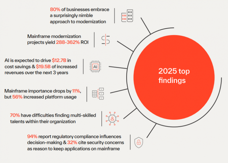 Los mainframes son depositarios críticos de datos sensibles, y la afluencia de requisitos de cumplimiento normativo está influyendo en las estrategias de modernización del mainframe para el 94% de las empresas. Regulaciones como la Digital Operational Resilience Act (DORA) de la UE de 2025, la Digital Personal Data Protection Act de la India de 2023 y la AI Act de la UE de 2024 están moldeando las decisiones organizativas.