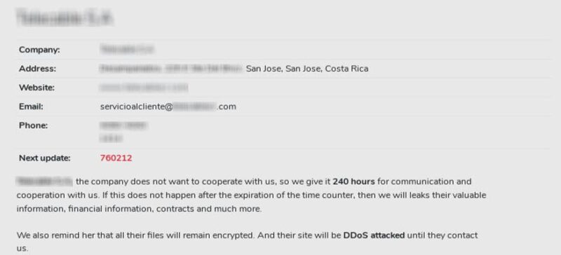 Otra reciente víctima en Latinoamérica fue una compañía costarricense de telecomunicaciones. Los operadores detrás de Avaddon amenazaron con realizar un ataque de DDoS a su sitio principal, al cual acuden sus usuarios y potenciales clientes interesados en los servicios que ofrece.