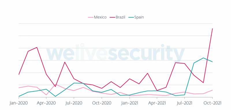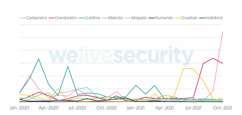 Aparte de Amavaldo, que quedó inactivo cerca de noviembre de 2020, todas las demás familias siguen activas al día de hoy. Brasil continúa siendo el país más atacado por estas familias de troyanos, seguido por España y México. Desde 2020, Grandoreiro y Mekotio se expandieron a Europa, principalmente a España. Lo que comenzó como varias campañas menores, probablemente para probar el nuevo territorio, se convirtió en algo mucho más grande. De hecho, en agosto y septiembre de 2021 Grandoreiro lanzó su mayor campaña hasta la fecha, dirigida a España. Mientras que Grandoreiro sigue dominando en España, Ousaban y Casbaneiro han dominado Brasil en los últimos meses. Mispadu parece haber cambiado su enfoque casi exclusivamente a México, ocasionalmente acompañado por Casbaneiro y Grandoreiro.
