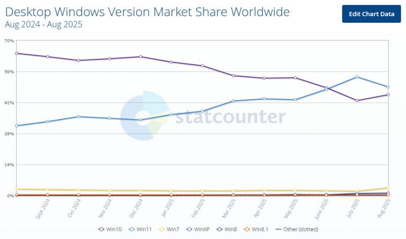 Pero al menos el paso del tiempo y el miedo a quedarse en una versión sin soporte técnico había logrado que Windows 11 subiera en cuota. Hasta ahora. Windows 11 perdió cuota en agosto, algo que no sucedía desde hacía un año. Y no poco, ya que StatCounter indica que bajó más de cuatro puntos porcentuales hasta el 49,02%. Por su parte, Windows 10 ganó casi tres puntos hasta el 45,65%, una cuota que indica que a poco más de un mes de su final del ciclo de vida hay decenas y decenas de millones de computadoras con esta versión.