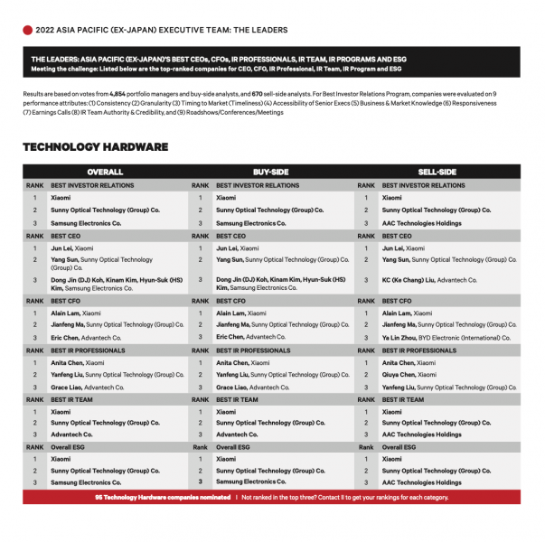 Las clasificaciones de la encuesta All-Asia Executive Team de este año evaluaron el desempeño de las empresas en el período de febrero de 2021 a enero de 2022, incluida la forma en que las empresas respondieron y desarrollaron las relaciones con los inversores en medio de la pandemia de Covid-19. Las clasificaciones se han convertido en un punto de referencia para los estándares superiores de gobierno corporativo, ya que son votadas por miembros reconocidos dentro del sector financiero, y el riguroso proceso de evaluación garantiza la legitimidad de los premios.